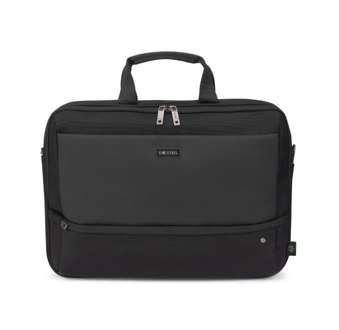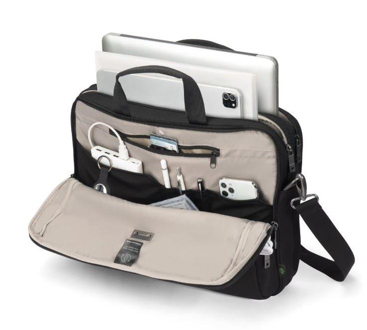 The Top Traveller FIVE is designed to protect your devices while keeping essentials easily accessible. The lockable notebook compartment with DCT Notebook Protection and HDF foam & EVA corner padding ensures maximum security, while an integrated slip pocket provides safe storage for tablets up to 12.9". The main compartment offers ample space for documents, folders, or mobile equipment, and the front section features organized pockets for accessories. A small front pocket adds extra storage for cables and smaller items. Made from 23.5 recycled PET bottles.